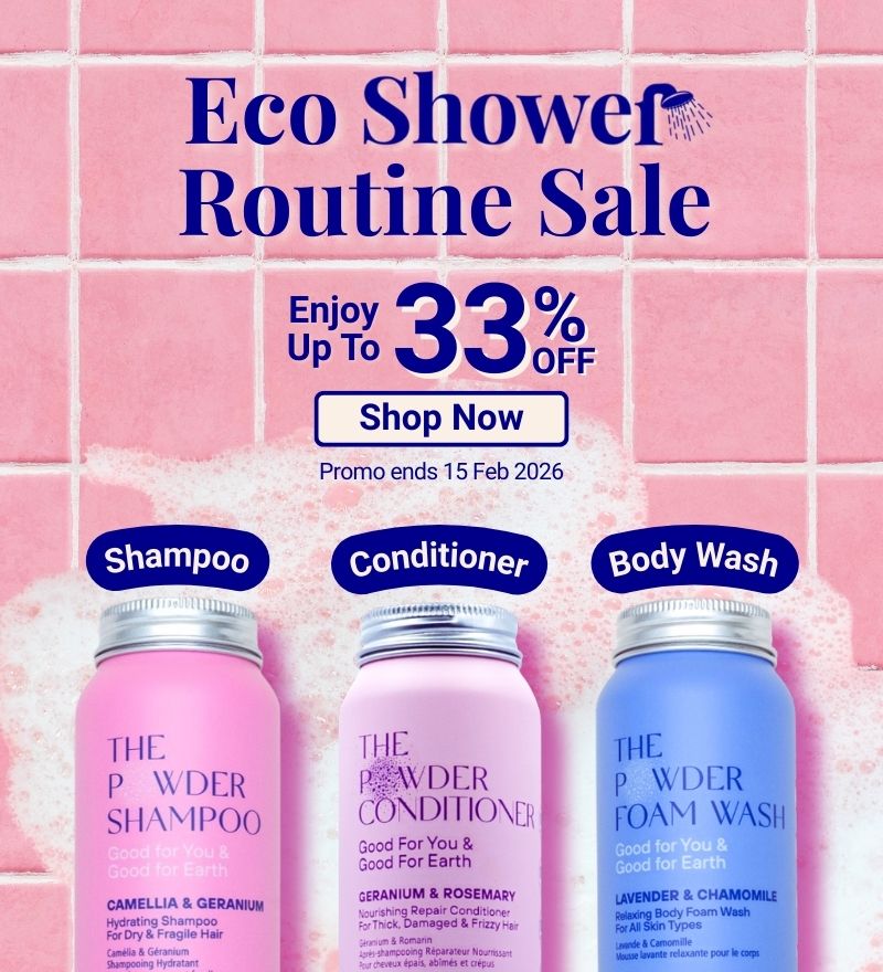 Two people holding colorful bottles with 'Healing Earth with Every Shower' text and branding.
