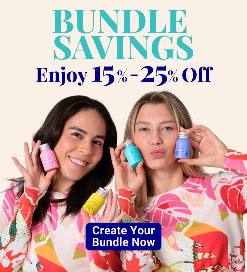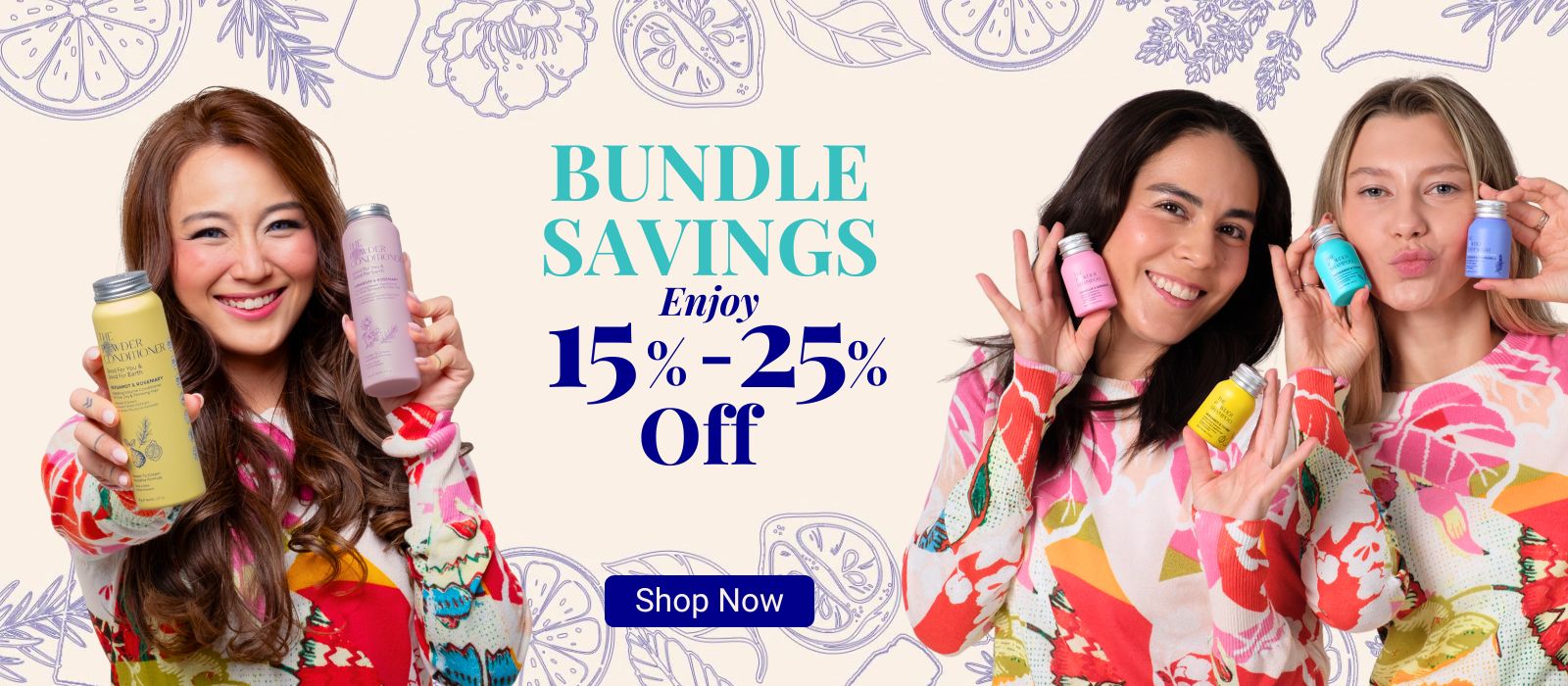 Two people holding colorful bottles with 'Healing Earth with Every Shower' text and branding.